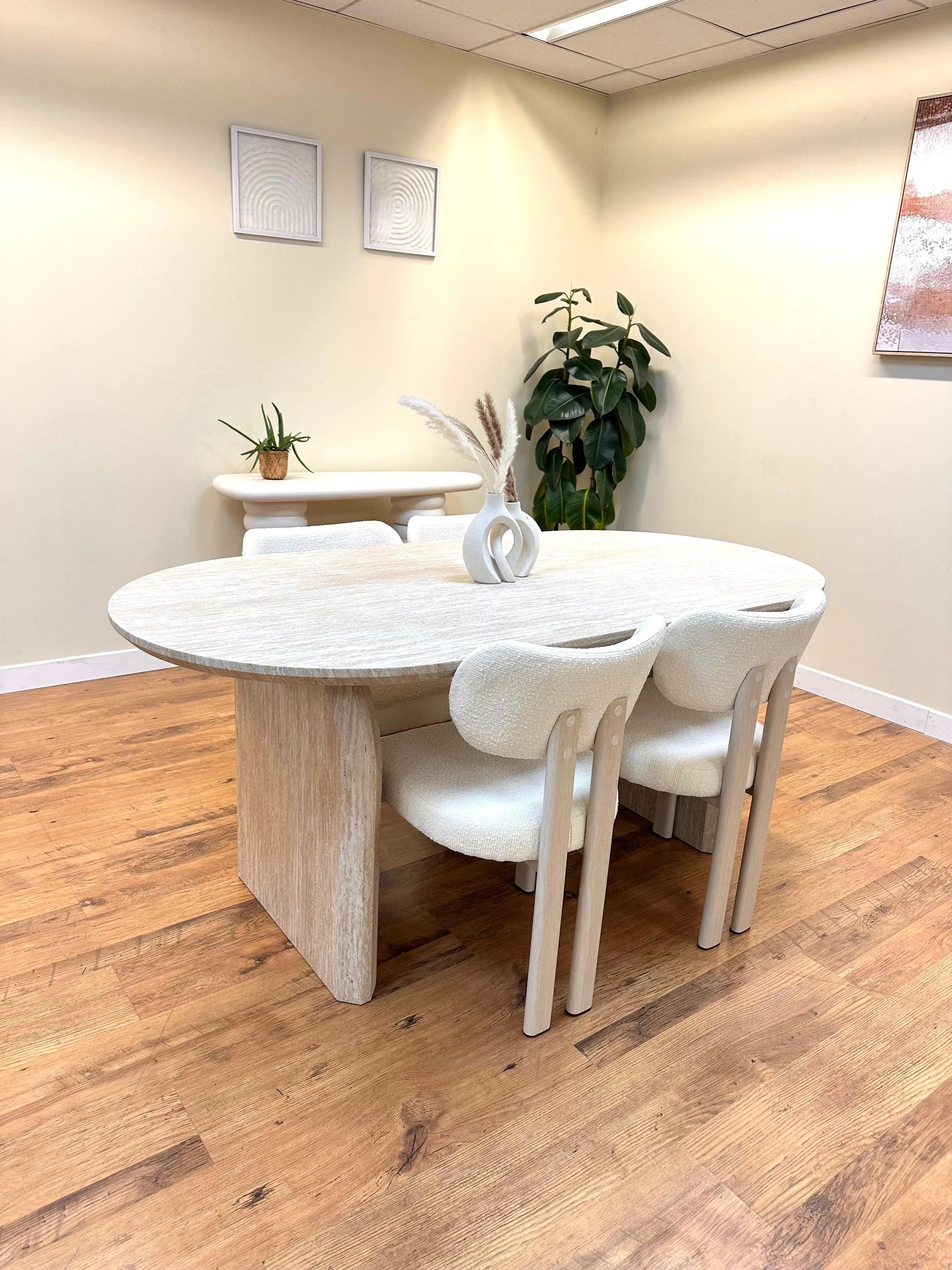 Leur revêtement en laine bouclée ne séduit pas seulement par son aspect chic : il offre une douceur au toucher et un confort d’assise remarquable, idéal pour profiter pleinement des moments passés autour de la table.