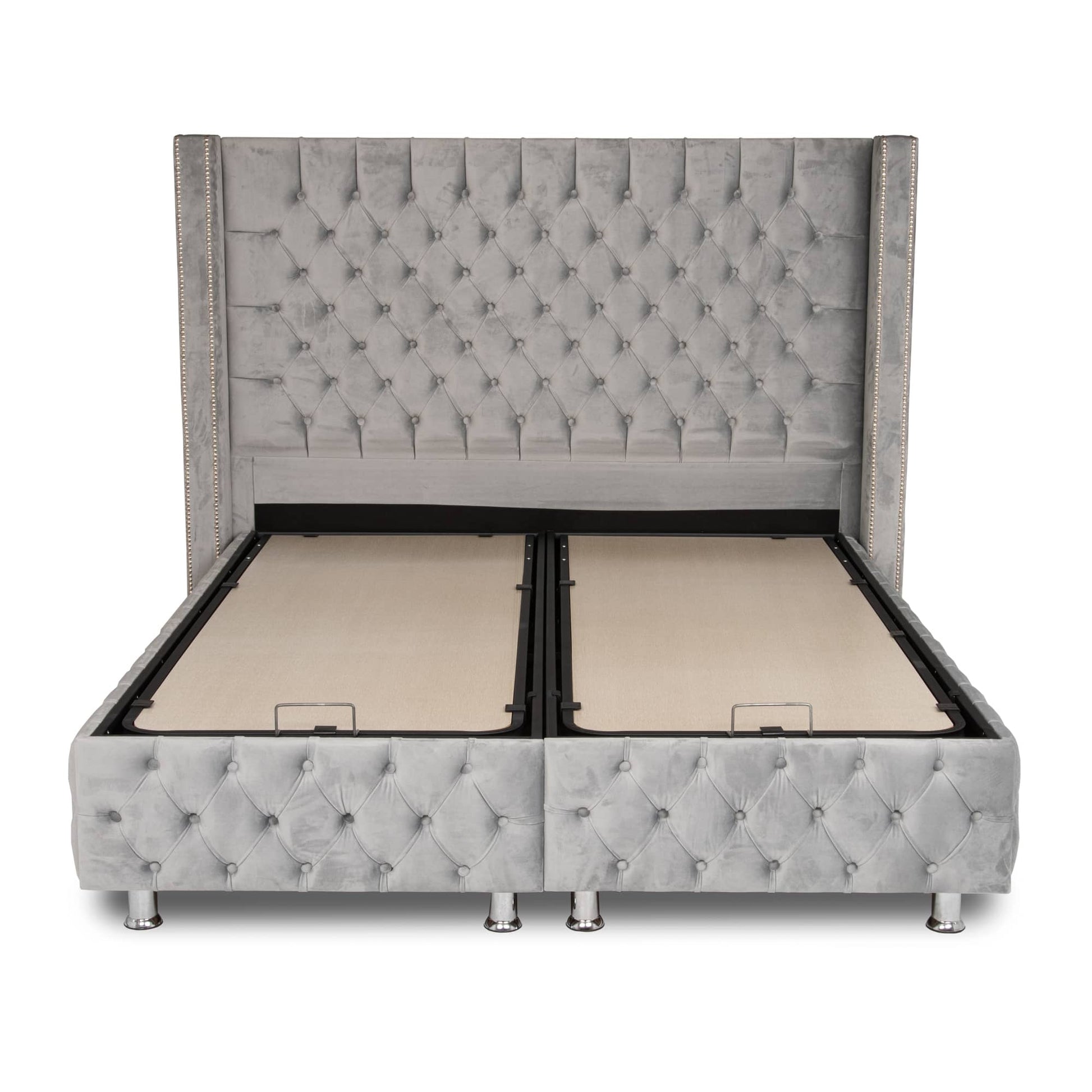 Voyez le confort en grand avec notre lit double capitonné avec coffre CLOUTE en tissu velours gris.