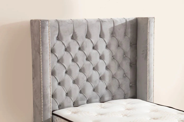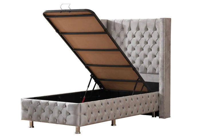 Votre lit coffre apporte élégance et modernisme à votre chambre à coucher. Les éléments constitutifs : tête de lit cloutée, tissu en velours gris et pieds de lit chromés de votre lit capitonné embellissent votre intérieur avec un style royal et contemporain. Obtenez un gain de place grâce au coffre de votre lit 1 place qui dispose de l’espace nécessaire pour ranger vos draps, plaids, coussins et couettes.