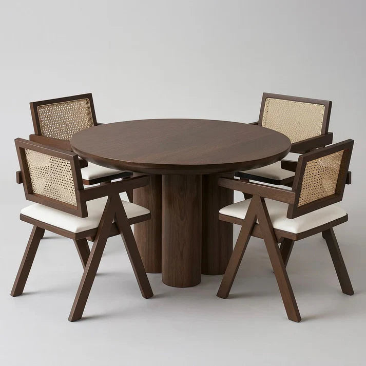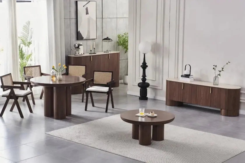 Son plateau rond de 110 cm, disponible en finition effet travertin ou noyer, accueille aisément de 4 à 6 convives, favorisant des échanges conviviaux.
